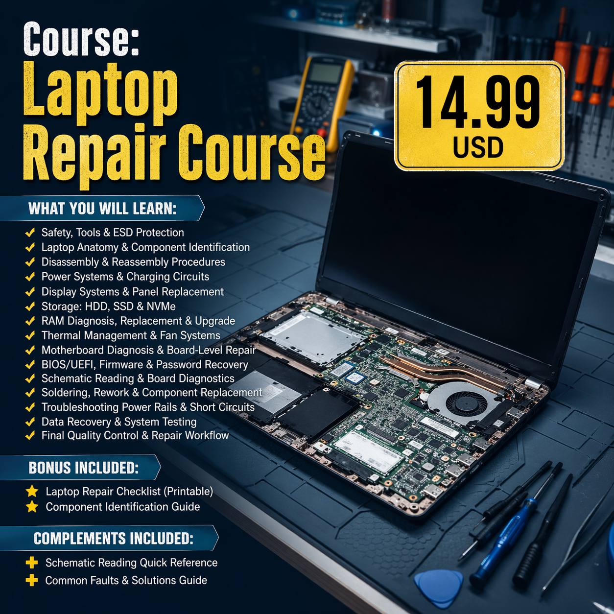 This course covers the full repair workflow — from safely opening a laptop for the first time, to diagnosing complex motherboard faults and delivering a properly tested, working device. Whether you're starting from scratch or looking to sharpen your existing knowledge, every module is built to be practical, logical, and immediately applicable. No fluff, no filler — just the real skills used in professional laptop repair.
